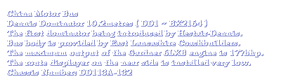 In the early of 1979, Dennis introduced the first Dominator to China Motor Bus for demonstration in Hong Kong. The bus fitted with East Lancashire Coachbuilders bodywork with 10.2-metre in length. It is powered by a Gardner 6LXB engine and transmitted with Voith D851 fully-automatic gearbox. CMB registered the bus as BX2164 with fleet number as DD1.