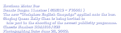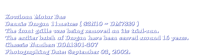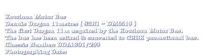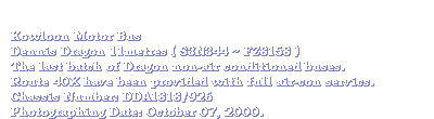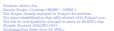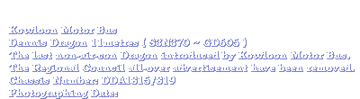 Since December 1986, the Kowloon Motor Bus started to acquire Dennis Dragon 11-metre non-air-con fleets. Totally 370 Dragons 11-metre were being introduced until 1994. All over those 370 Dragons, they are all divided into 9 different specifications.