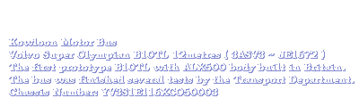 Around the 3rd and the 4th quarter of 1998, after the first Super Olympian B10TL chassis had been shown in the UITP exhibition, Kowloon Motor Bus placed the first order for 61 of that model with one of them being a prototype from Sweden Volvo Bus Corporation. Being released in October 1998, the Volvo Super Olympian have played an important role in the franchised bus services in Hong Kong.