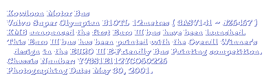 In April 2001, the last Super Olympian 12metres of the third batch order is being assembled and issued a license of JZ6467 (3ASV141). KMB is then tuned the engine in order to make it fulfilled to the Euro III standard.