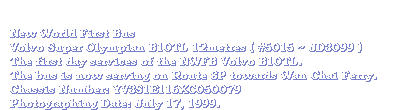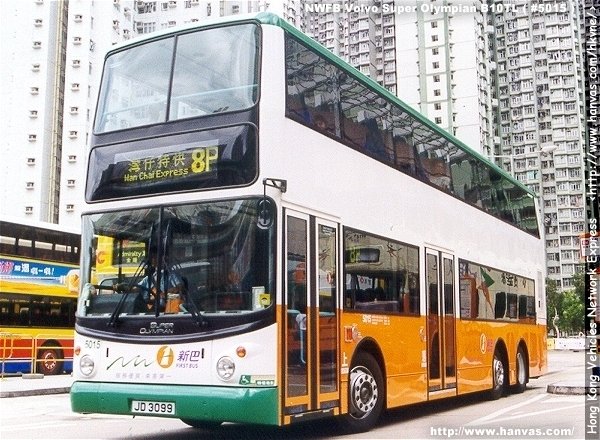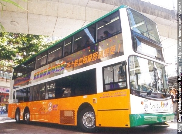 Immediately after the Kowloon Motor Bus made the order of 61 Super Olympian B10TL 12m, the New World First Bus also ordered 40 of them in the early of November of 1998. The first one was delivered to HK in the mid of 1999 and attempted the test by Transport Department on June 26. New World First Bus was then fleeted these batch of Super Olympian as #5001 - #5040.