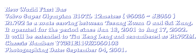 In September 2001, the New World First Bus made again the order of Volvo Super Olympian 12-metre, totally 14 new buses will be acquired. The #5090 - #5103 are now going to put into services since the end of October 2002.