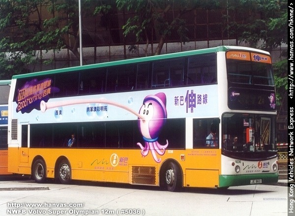 In October 2000, the second batch of Super Olympian started to put into services. Totally 20 buses acquired in this batch. Most of them were arranged to serve on the Tseung Kwan O bus routes. Those Volvo Super Olympian for New World First Bus were installed with Volvo D10A Euro-II engine. The cylinder capacity of the engine is 9,603cc and can perform the maximum power output of 285bhp. The modified Alexander ALX500 bodywork also being introduced to these Super Olympian.